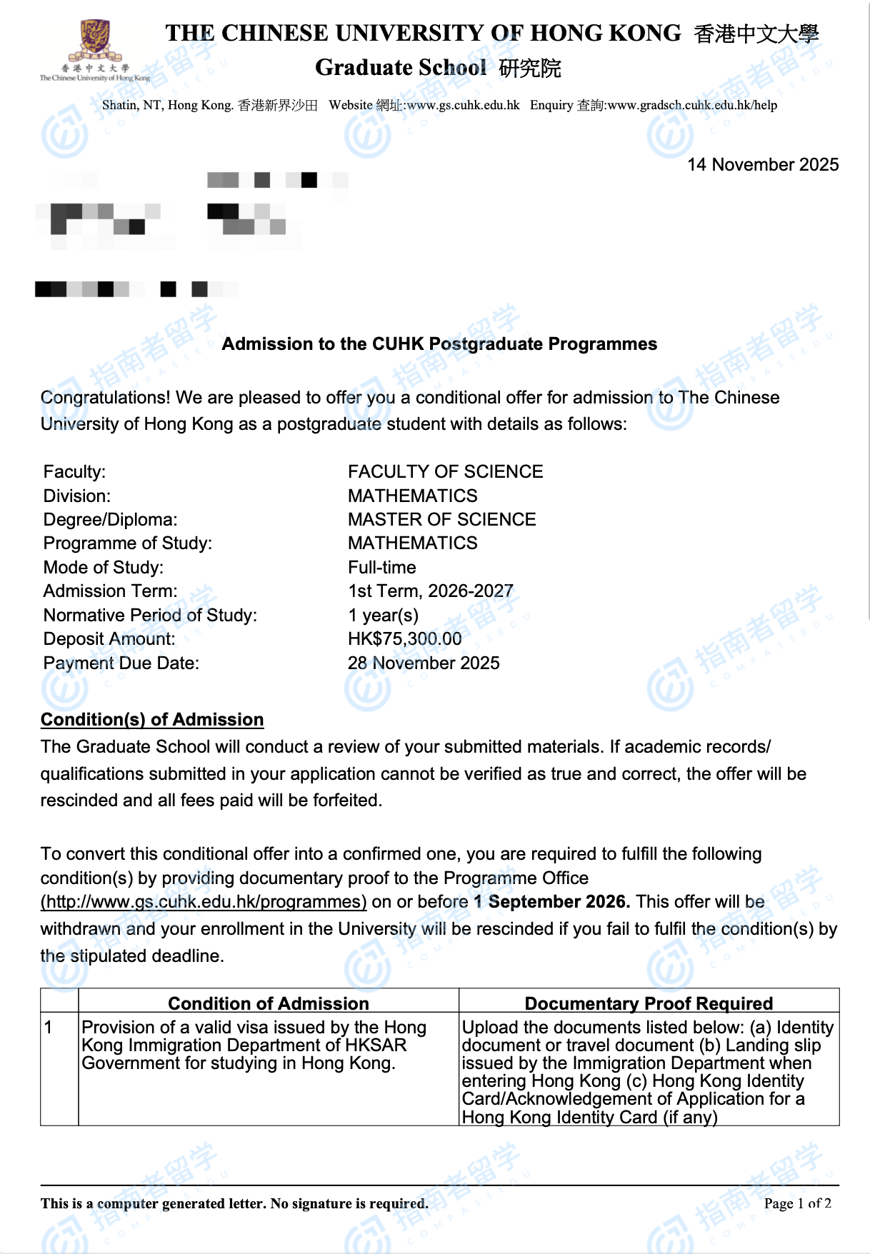 香港中文大學(xué)數(shù)學(xué)理學(xué)碩士研究生offer一枚