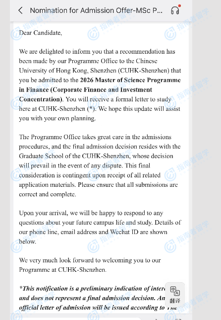 香港中文大學(xué)金融學(xué)理學(xué)碩士(CUHK-Shenzhen)研究生offer一枚