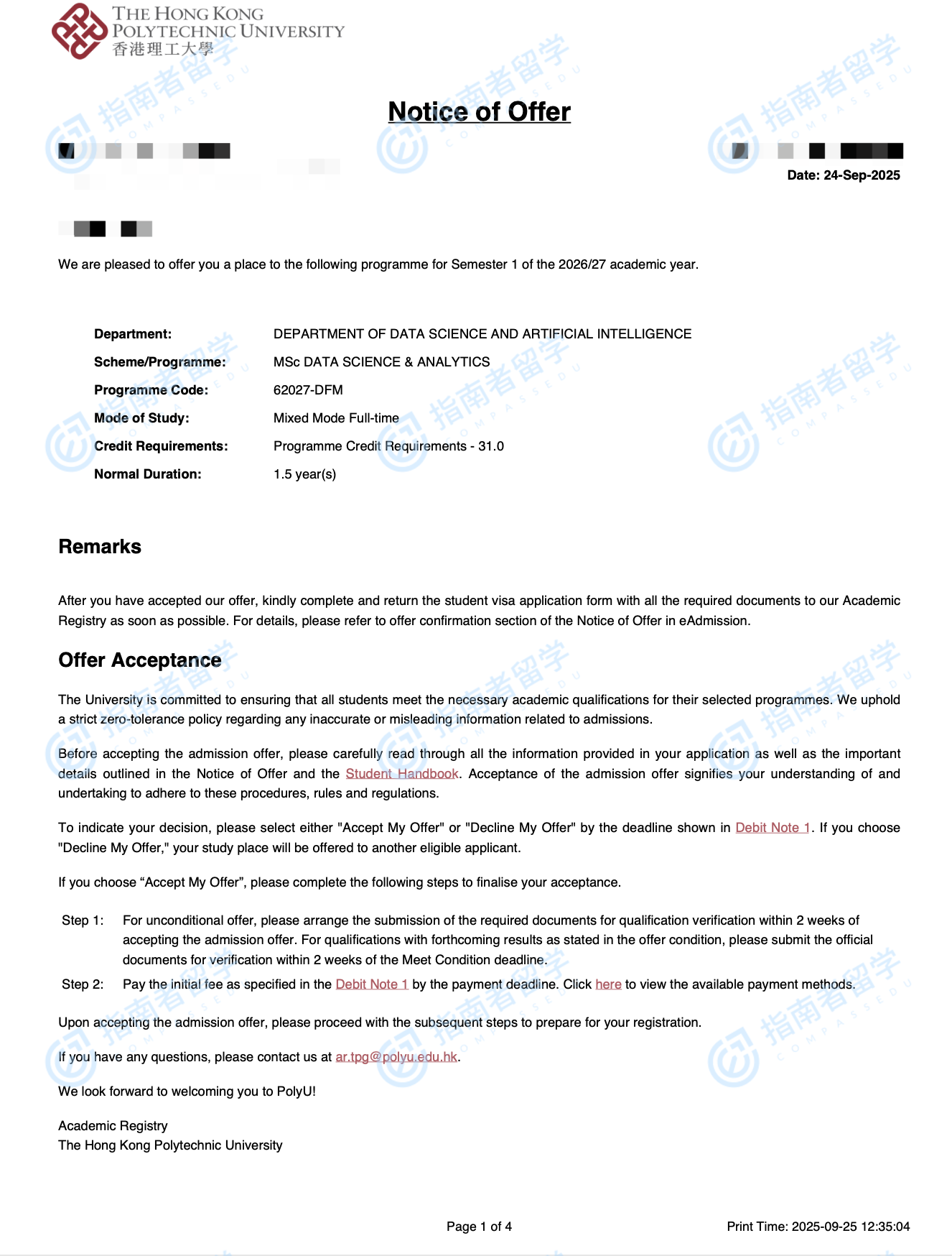 香港理工大學資訊科技理學碩士研究生offer一枚