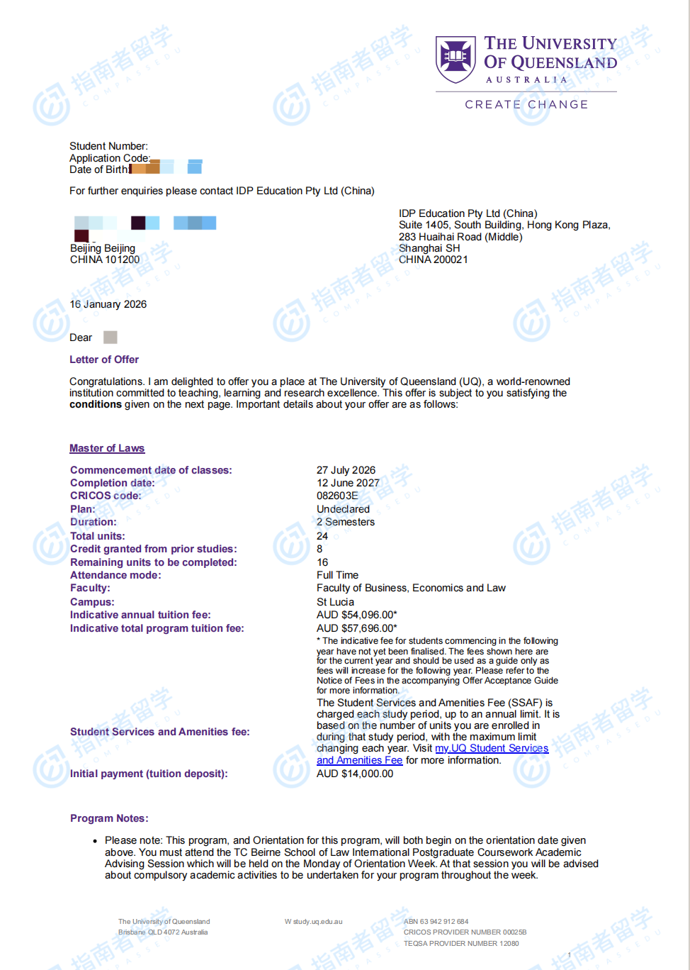 昆士蘭大學(xué)法學(xué)碩士(1年制)研究生offer一枚
