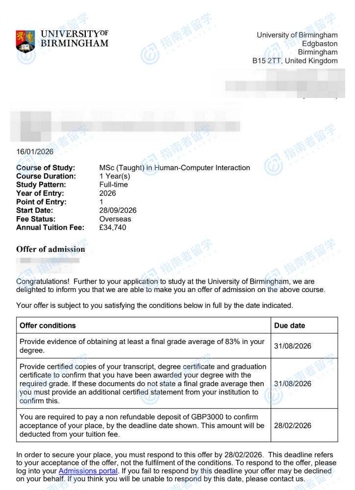 伯明翰大學(xué)人機(jī)交互理學(xué)碩士研究生offer一枚