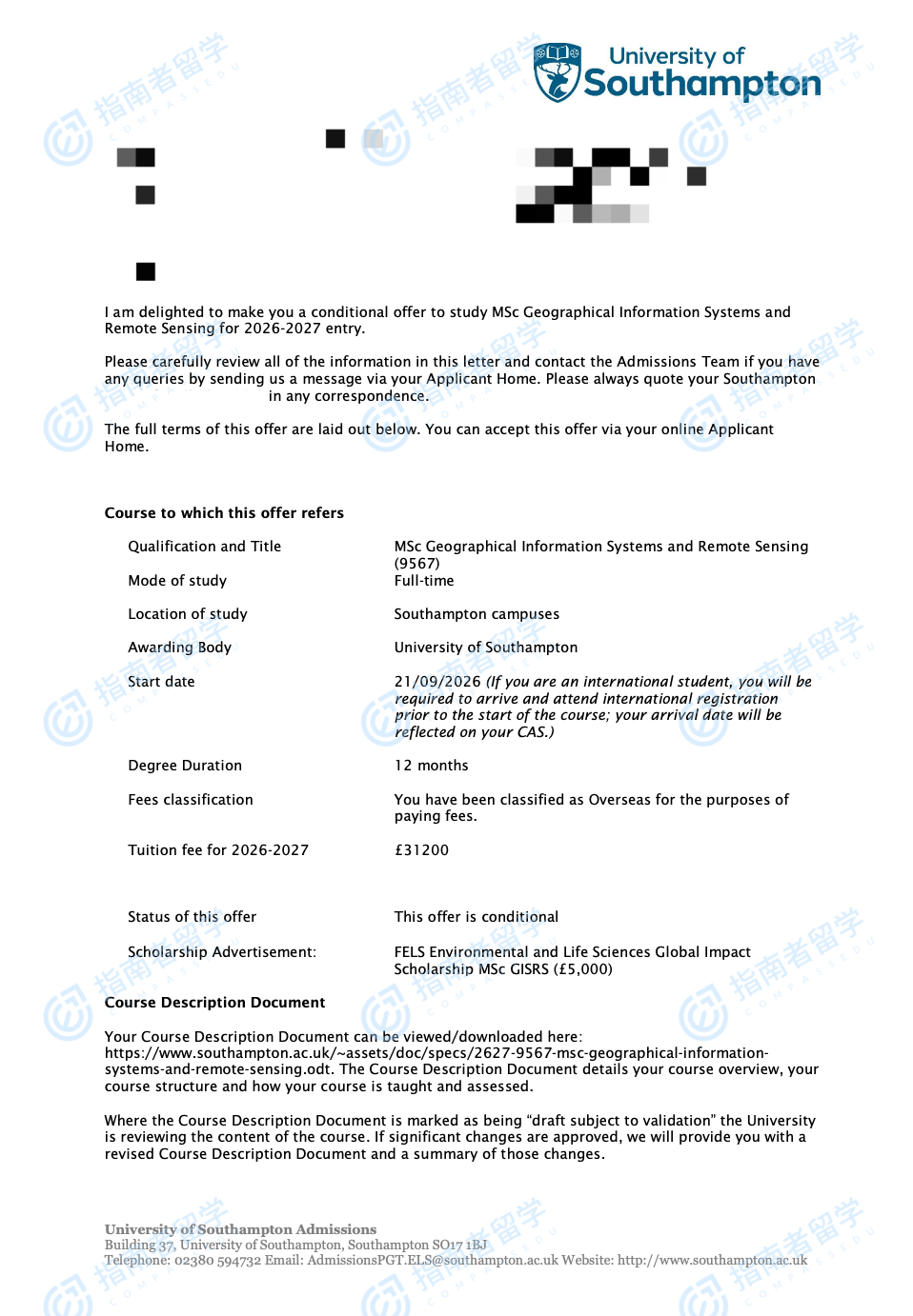 南安普頓大學(xué)應(yīng)用地理信息系統(tǒng)與遙感理學(xué)碩士研究生offer一枚