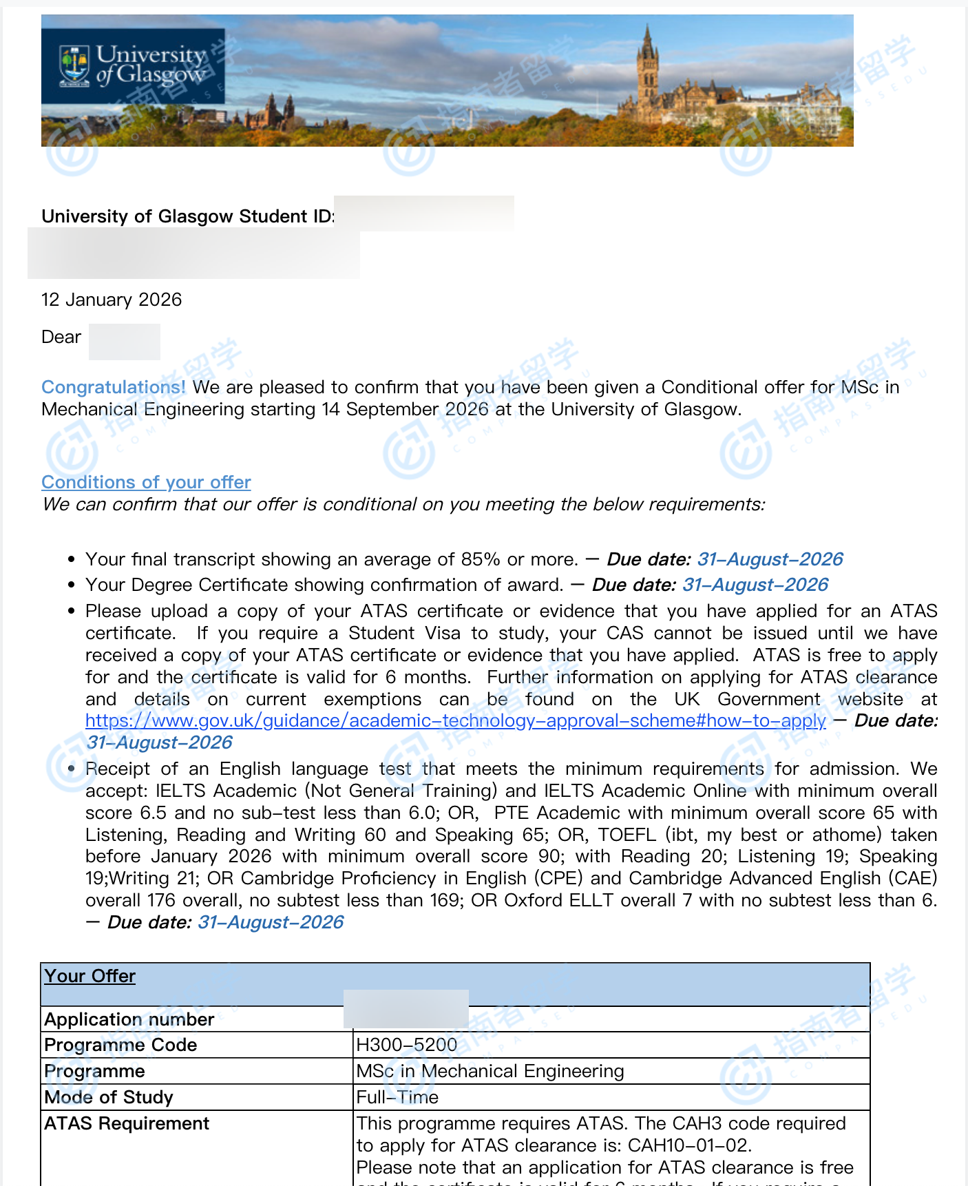 格拉斯哥大學機械工程理學碩士研究生offer一枚