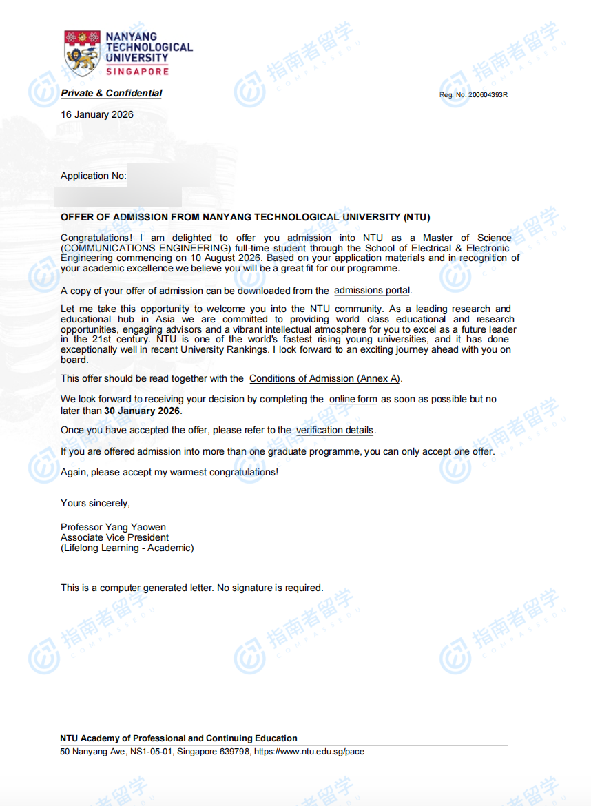 南洋理工大學(xué)通信工程理學(xué)碩士研究生offer一枚