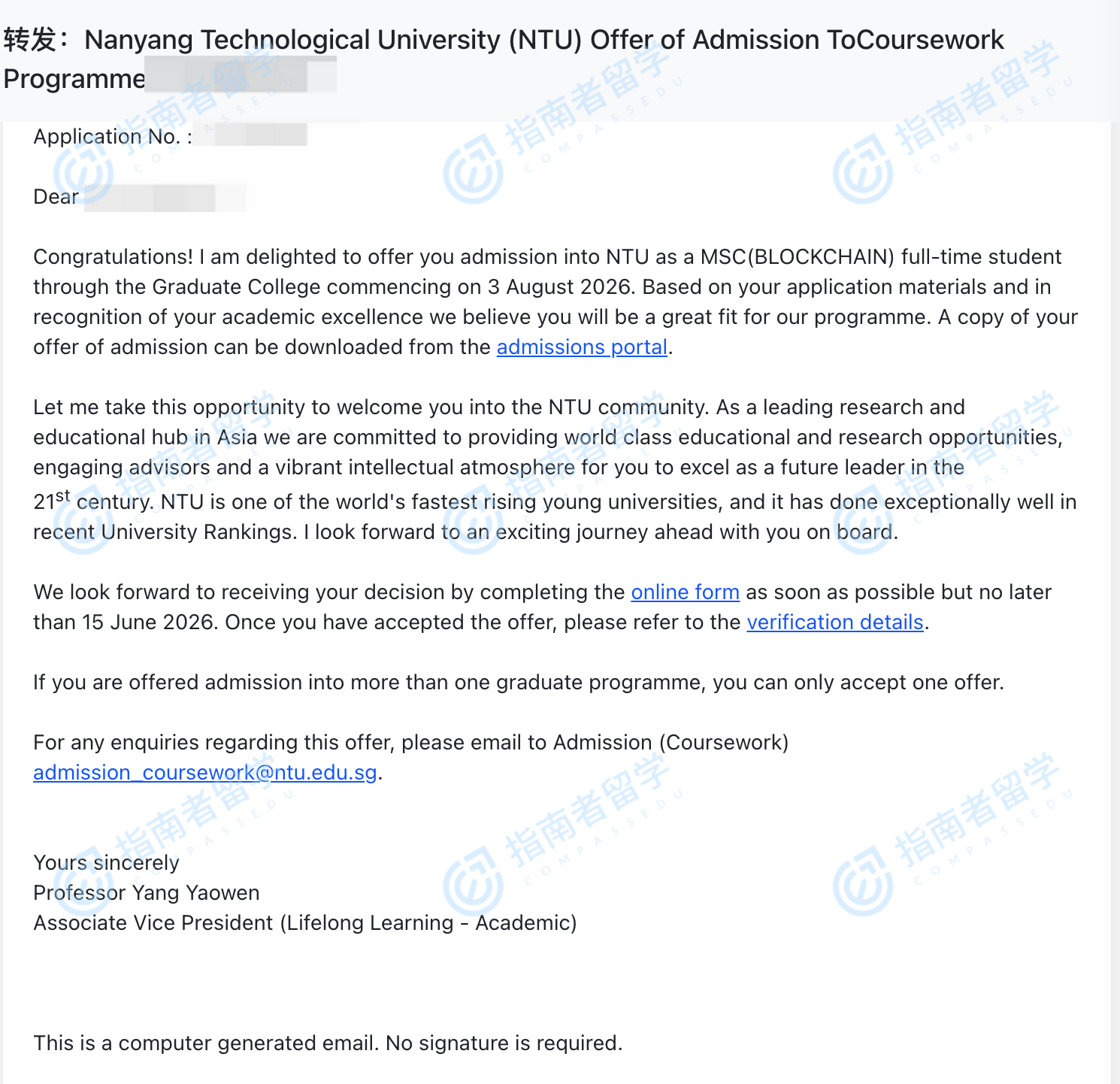 南洋理工大學(xué)區(qū)塊鏈理學(xué)碩士研究生offer一枚