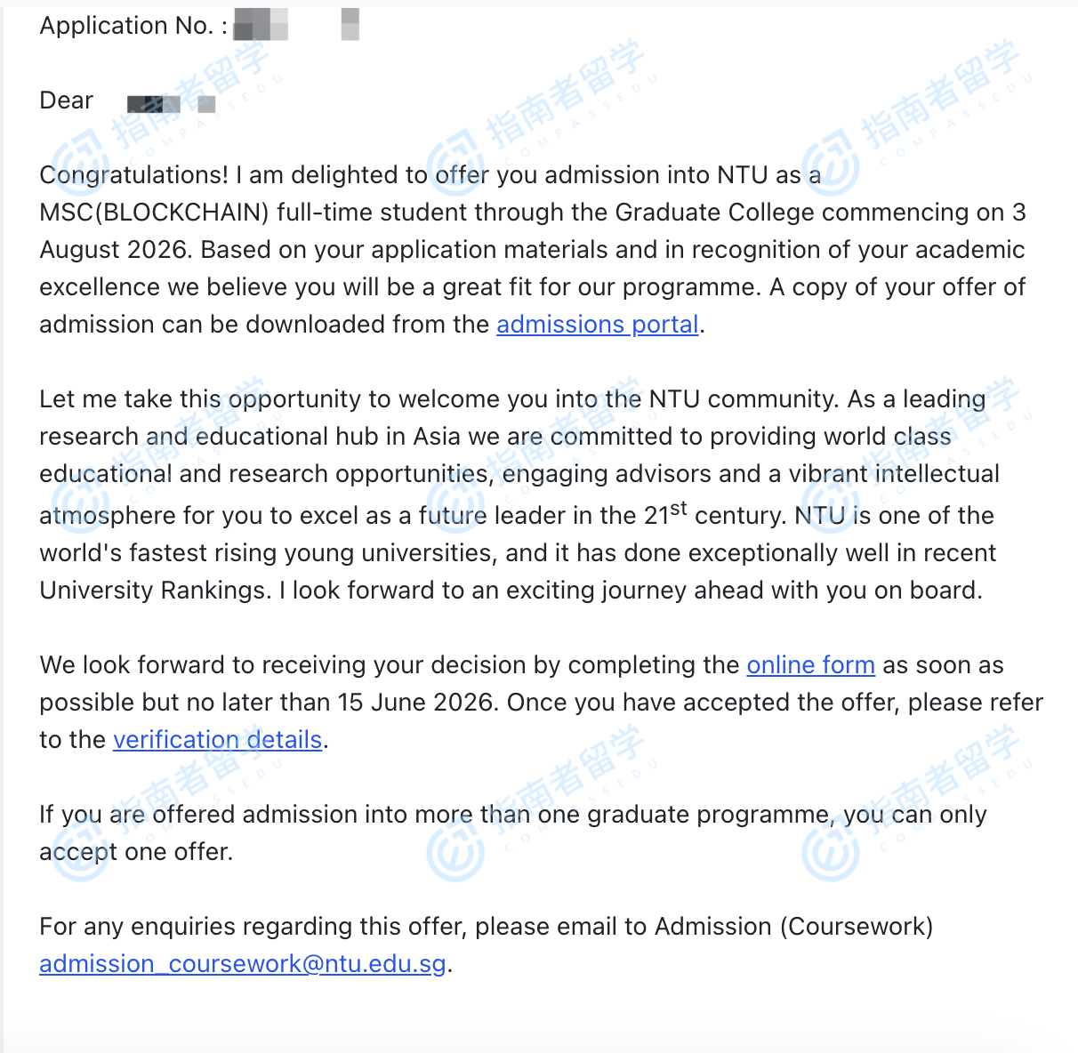 南洋理工大學(xué)區(qū)塊鏈理學(xué)碩士研究生offer一枚
