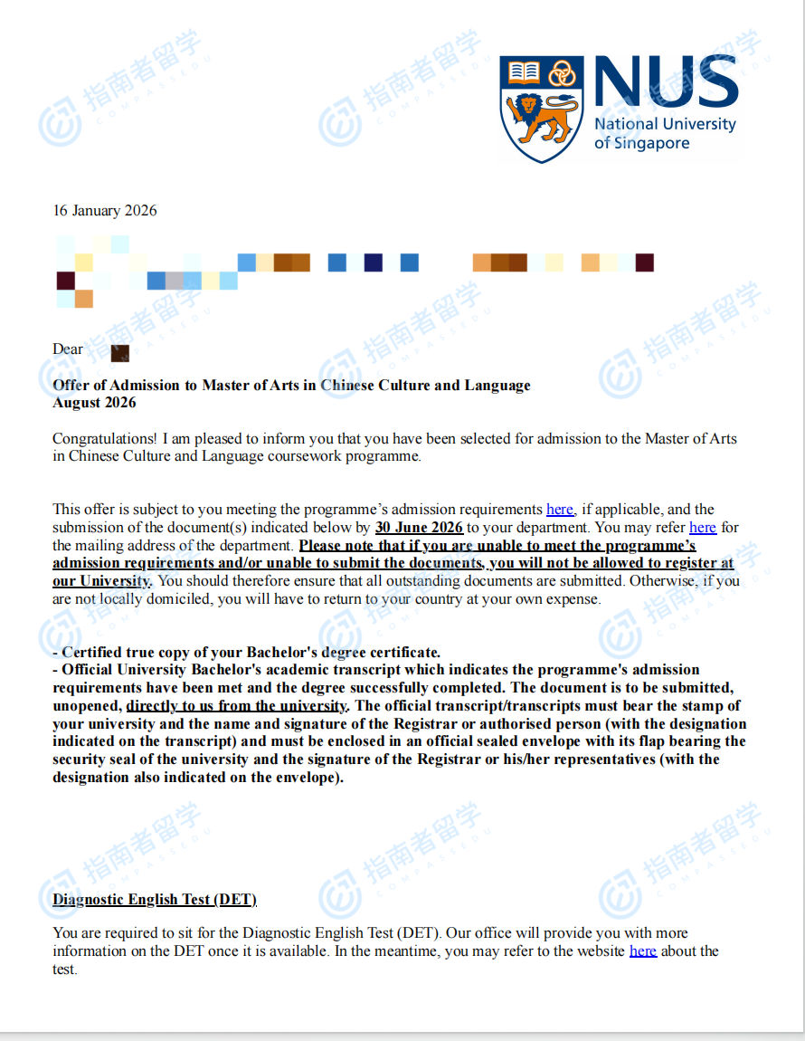 新加坡國立大學(xué)中國文化與語言文學(xué)碩士研究生offer一枚