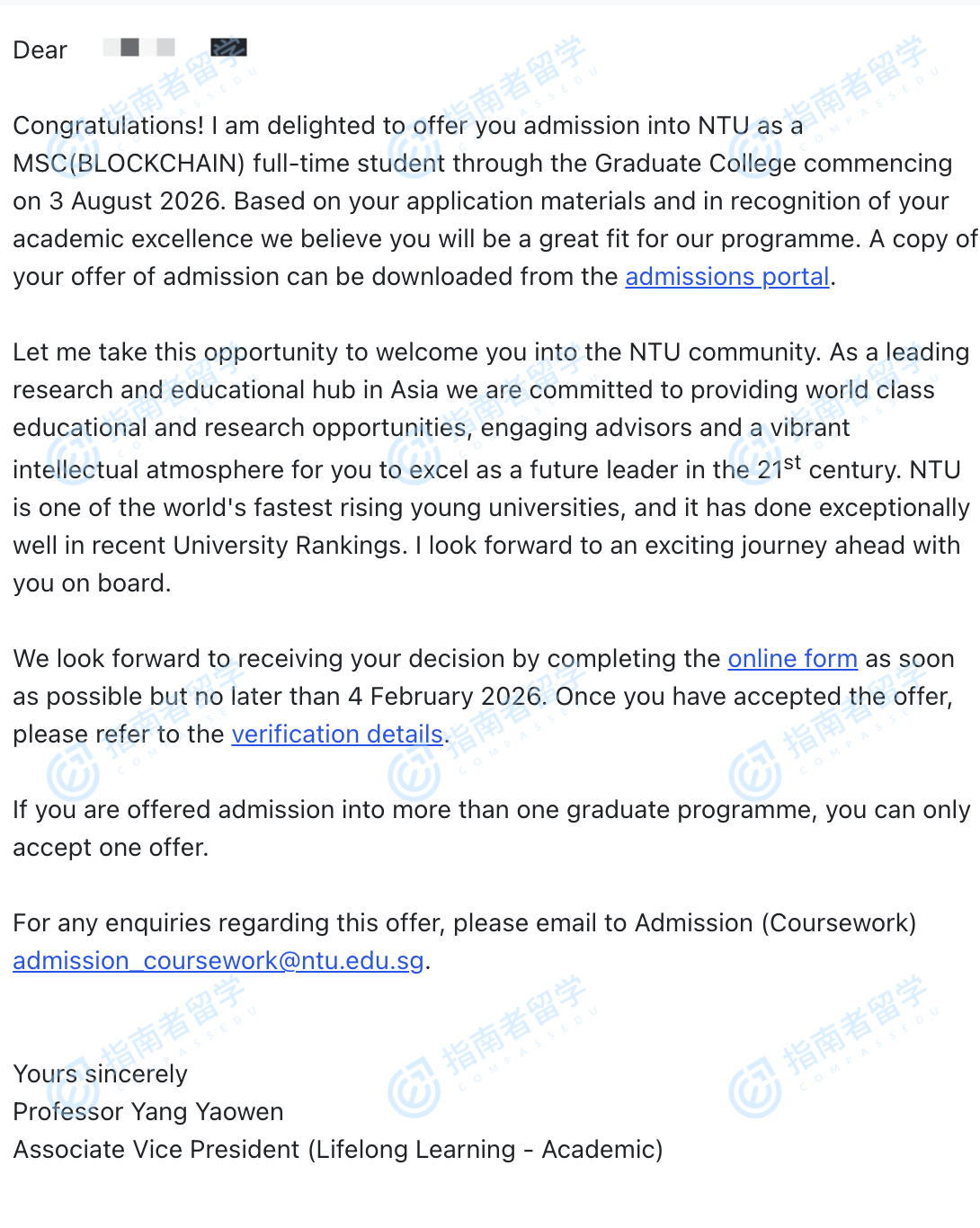 南洋理工大學(xué)區(qū)塊鏈理學(xué)碩士研究生offer一枚