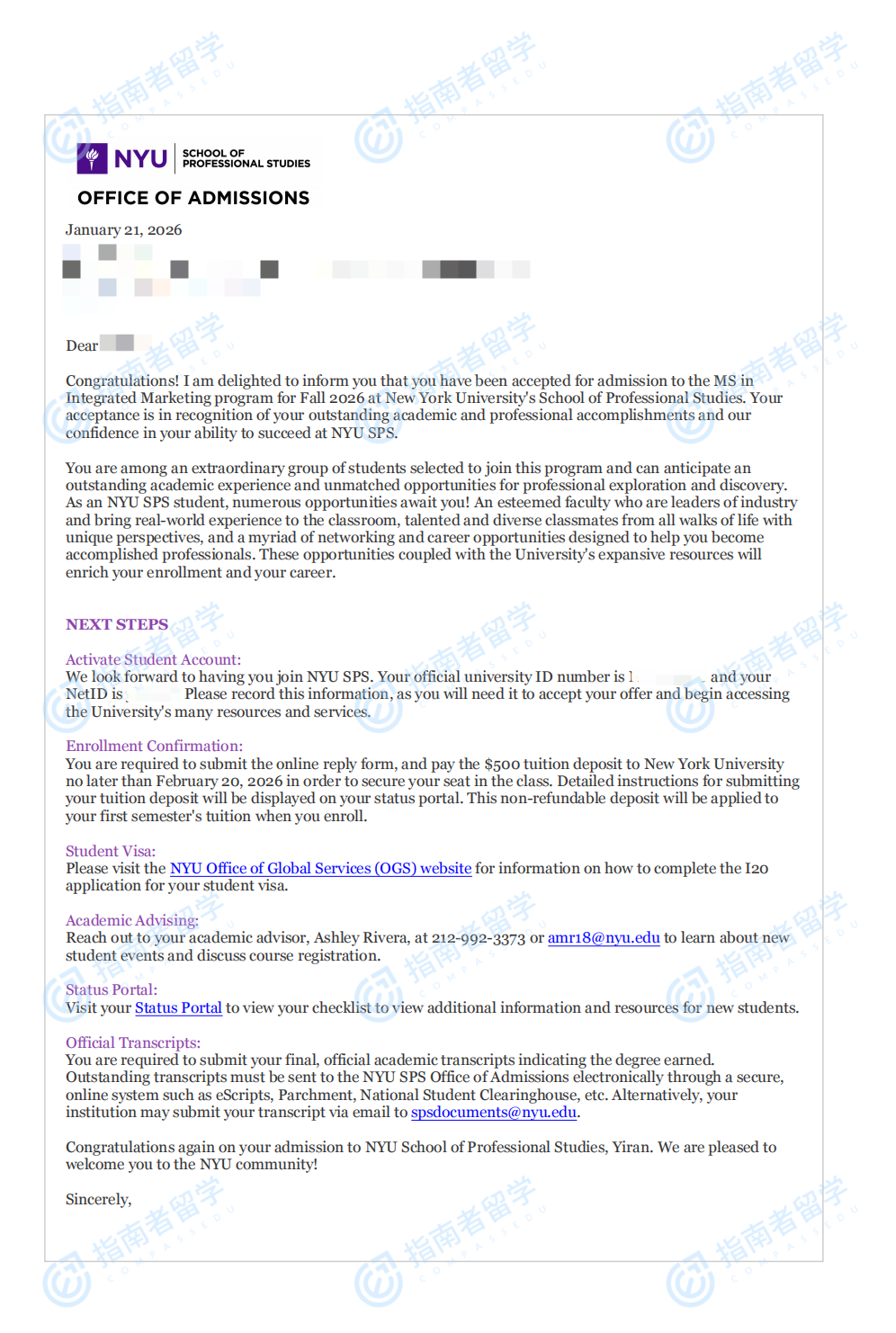 紐約大學(xué)整合營銷碩士研究生offer一枚