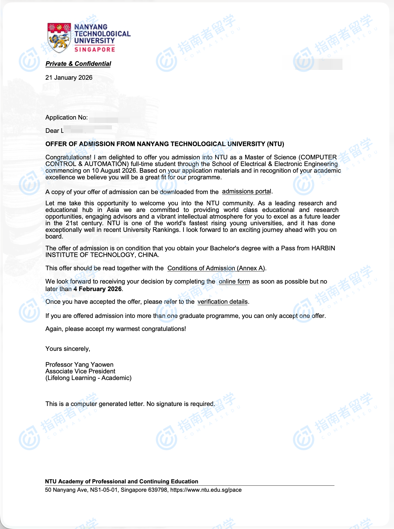 南洋理工大學(xué)計算機控制與自動化理學(xué)碩士研究生offer一枚
