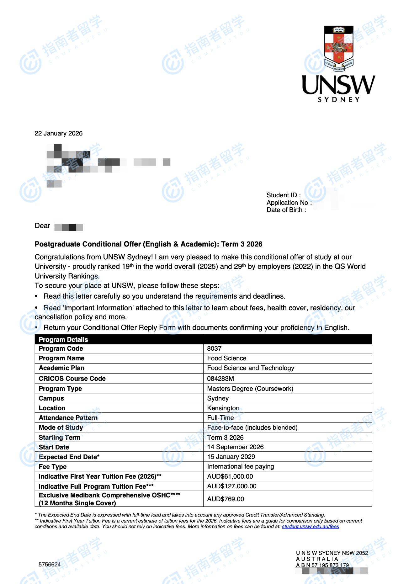 新南威爾士大學(xué)食品科學(xué)碩士研究生offer一枚