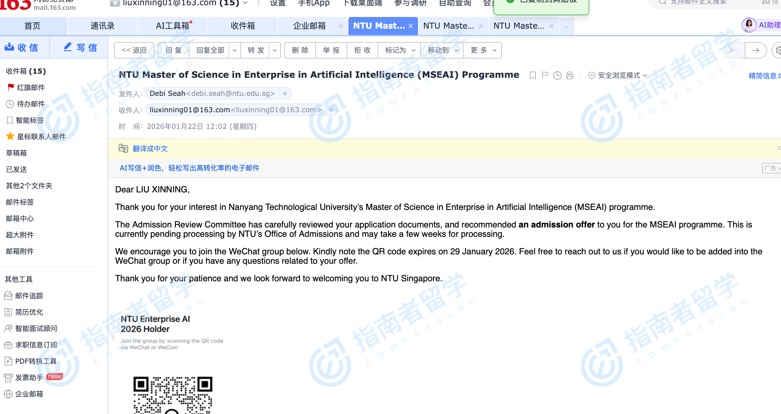 南洋理工大學(xué)企業(yè)人工智能理學(xué)碩士研究生offer一枚