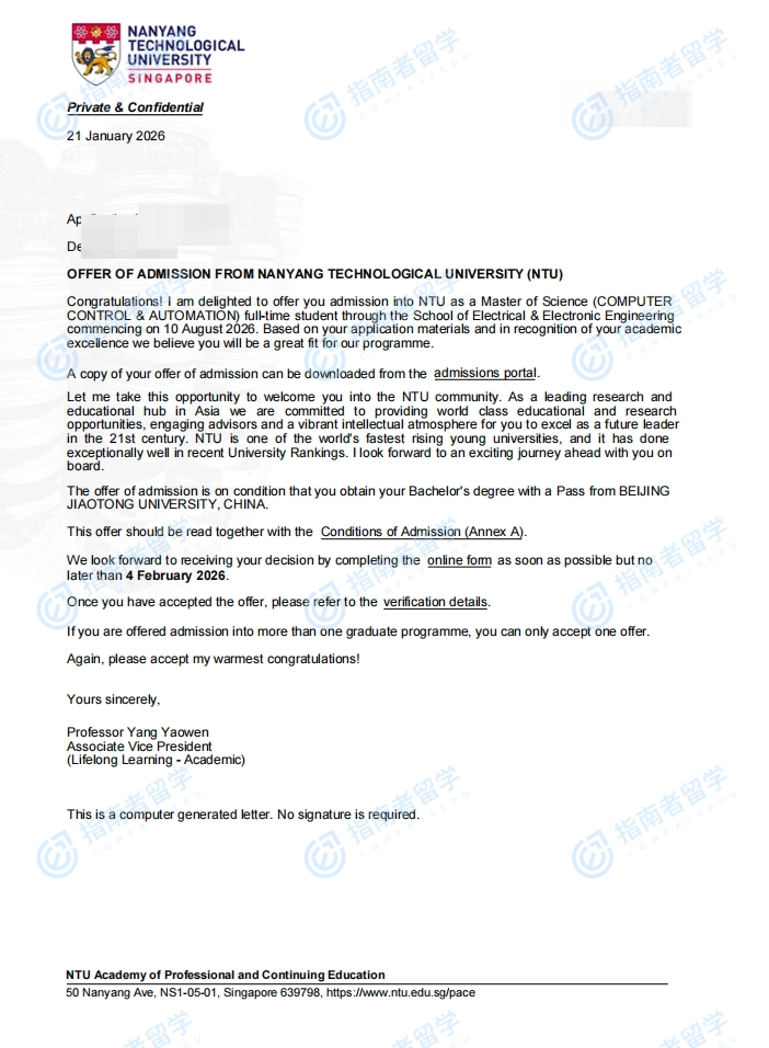 南洋理工大學計算機控制與自動化理學碩士研究生offer一枚
