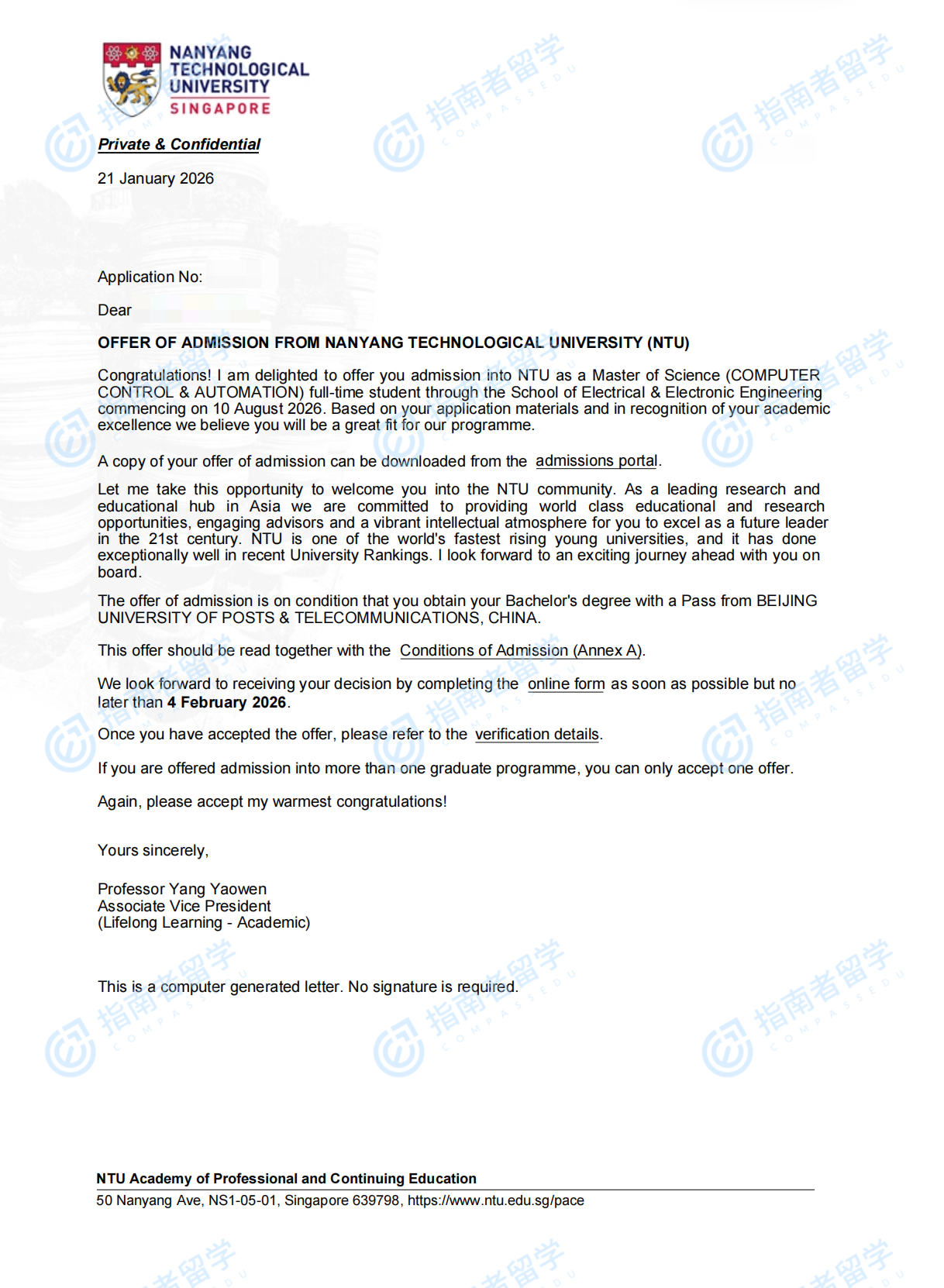 南洋理工大學計算機控制與自動化理學碩士研究生offer一枚