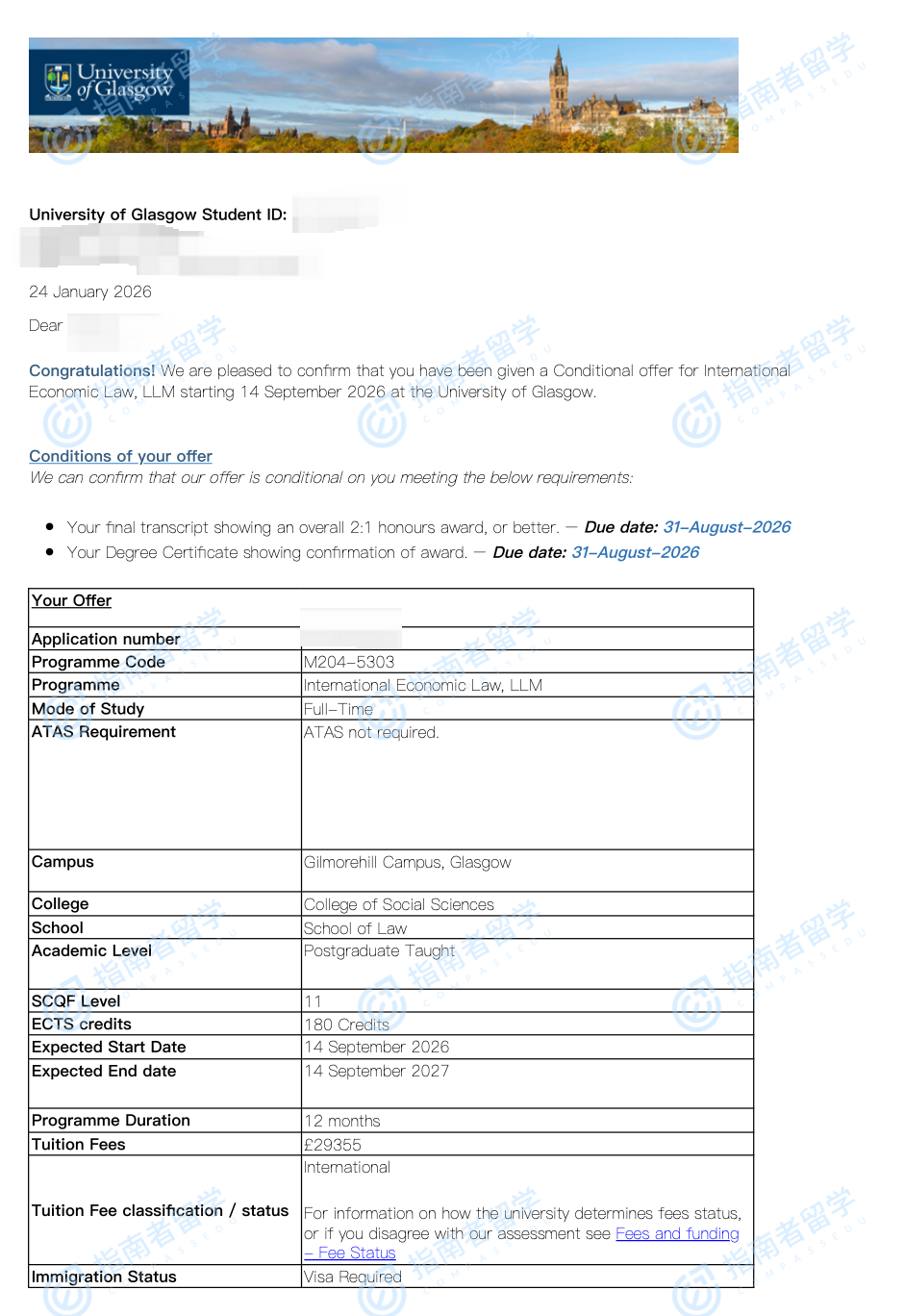格拉斯哥大學國際經(jīng)濟法法學碩士研究生offer一枚